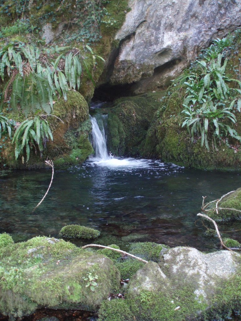 Une courte marche dans la prairie enluminée par les touffes de jonquilles ou de primevères, et nous apercevons sortant d’une anfractuosité de la roche une cascade qui se précipite dans une vasque entourée de fougères. C’est l’Ardeous qui bouillonne à travers les cailloux moussus. Mais d‘où vient cette eau ? Quel est son mystérieux chemin sous terre ? Nous ne le savons pas. Cependant, je suppose que la curiosité de l’un d’entre nous le fera se pencher sur cartes et topos pour nous dire : « je sais, je sais, je sais »