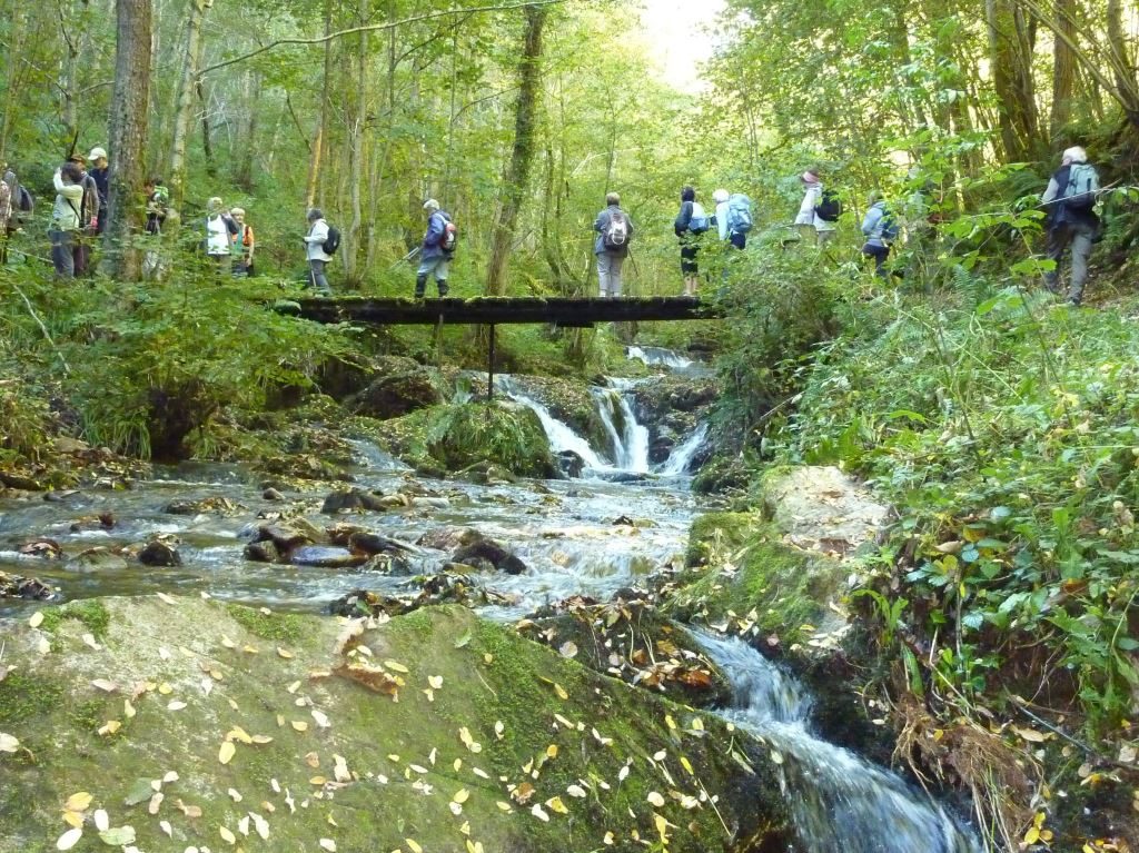 clous. Passionnant moment. La marche le long d’un ruisseau bouillonnant, à l’eau limpide, qui alimentait des moulins, (en 1670 cinq martinets de forge étaient situés sur le même ruisseau, avec un feu et un marteau chacun, « moulin de Quié »…), surprenait par son nattendue beauté sauvage. Tout autant, sa traversée sur un solide pont en bois qui rejoignait le chemin herbeux du retour vers l’aval, avec sur son flanc droit un mur de